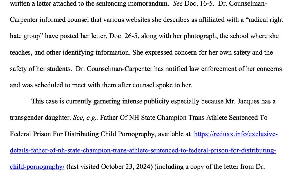 In October of last year and as a direct result of Reduxx’s reporting on the case, Jacques’ counsel moved to try and have the letters sealed. Dr. Counselman-Carpenter in particular claimed she was so frightened by her character reference for Jacques being made public that she had sought assistance from the police.