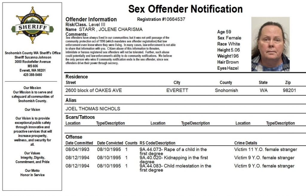 The notice reveals that Starr has been assessed as a Risk Level 3, which is defined by Snohomish County as extremely high risk offenders “who are a threat to reoffend if provided the opportunity.” The definition goes on to state that most offenders in this category “have prior sex crime convictions as well as other criminal convictions. Their lifestyles and choices place them in this classification. Some have predatory characteristics and may seek out victims. They may have refused or failed to complete approved treatment programs.”